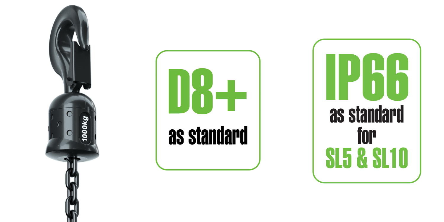 - IP66 and NEMA 4X protection as standard for the entire hoist.