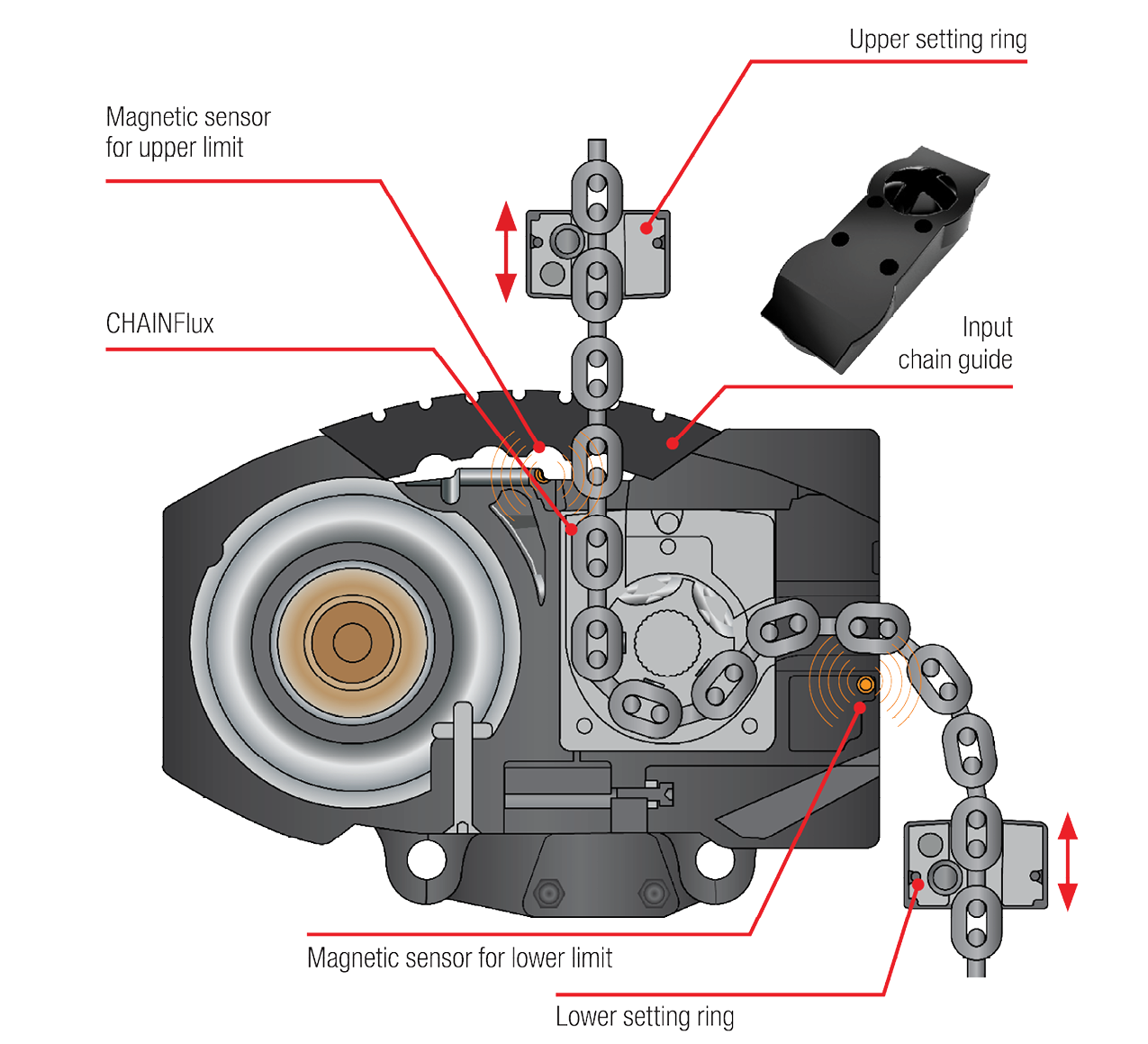 The Limitflux is a built-in limit switch device in the CHAINFlux that’s allow to control setting of hoist or hook position in industrial suspension or climbing configuration. Accuracy of the system is given at one link of lifting chain. The setting of the limit is operated by two magnetic ring (upper and lower) which can be easily moved and set along the lifting chain.